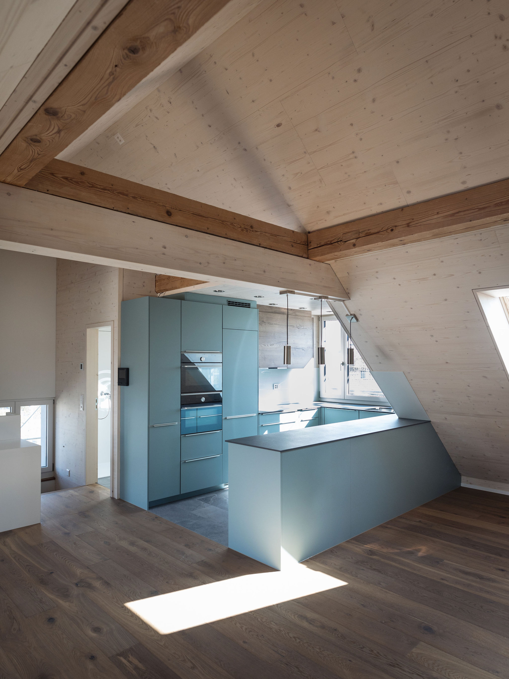 Wir haben mehr Lebensraum für unsere wachsende Familie gesucht... und ihn im Haus meiner Eltern gefunden. Die Idee von einem Anbau hatte meine Mutter schon vor vielen Jahren. Zusammen mit unserem Architekten, einem alten Schulfreund, haben wir nun aus einem «ganz normalen» Einfamilienhaus ein Mehrgenerationenheim mit zwei grossartigen Wohnungen geschaffen. Besonders stolz sind wir auf unsere offene Maisonette Wohnküche im Dachgeschoss. Wir haben den Estrich vollständig geöffnet und entstanden ist ein einzigartiger Wohn- und Lebensraum für die ganze Familie.