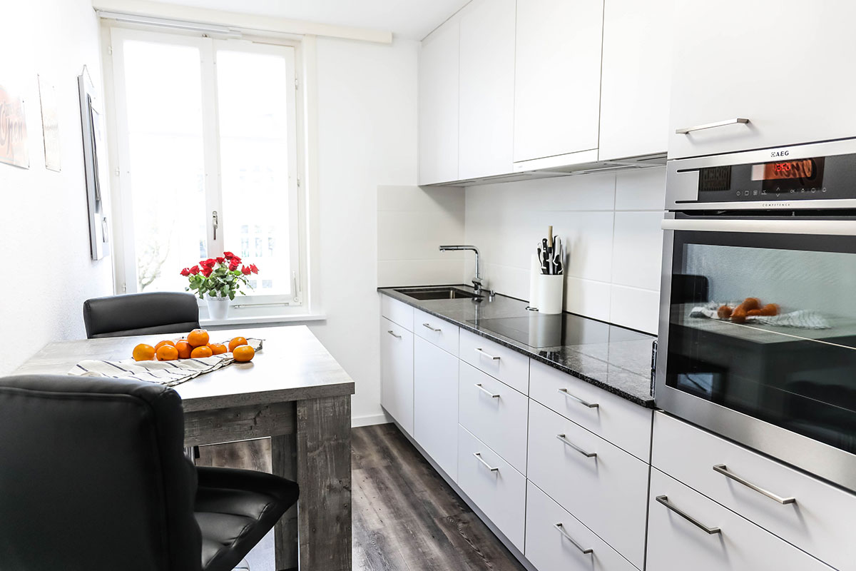 Unabhängig vom Budget ist das Wichtigste, dass man sich von fixen Vorstellungen löst, die man vielleicht hat. Der Raum gibt vor, was am Besten passt. Unsere Küche, zum Beispiel, ist lang und schmal mit einem grossen Fenster an der kurzen Seite. Damit wir den Raum clever nutzen können, haben wir uns für eine MAXIMA Küchenzeile mit neutralen, hellgrauen Fronten und einer Granitabdeckung entschieden. Die Kombination harmoniert mit dem Raum und wird auch in Zukunft für weitere Mieter funktionieren.
