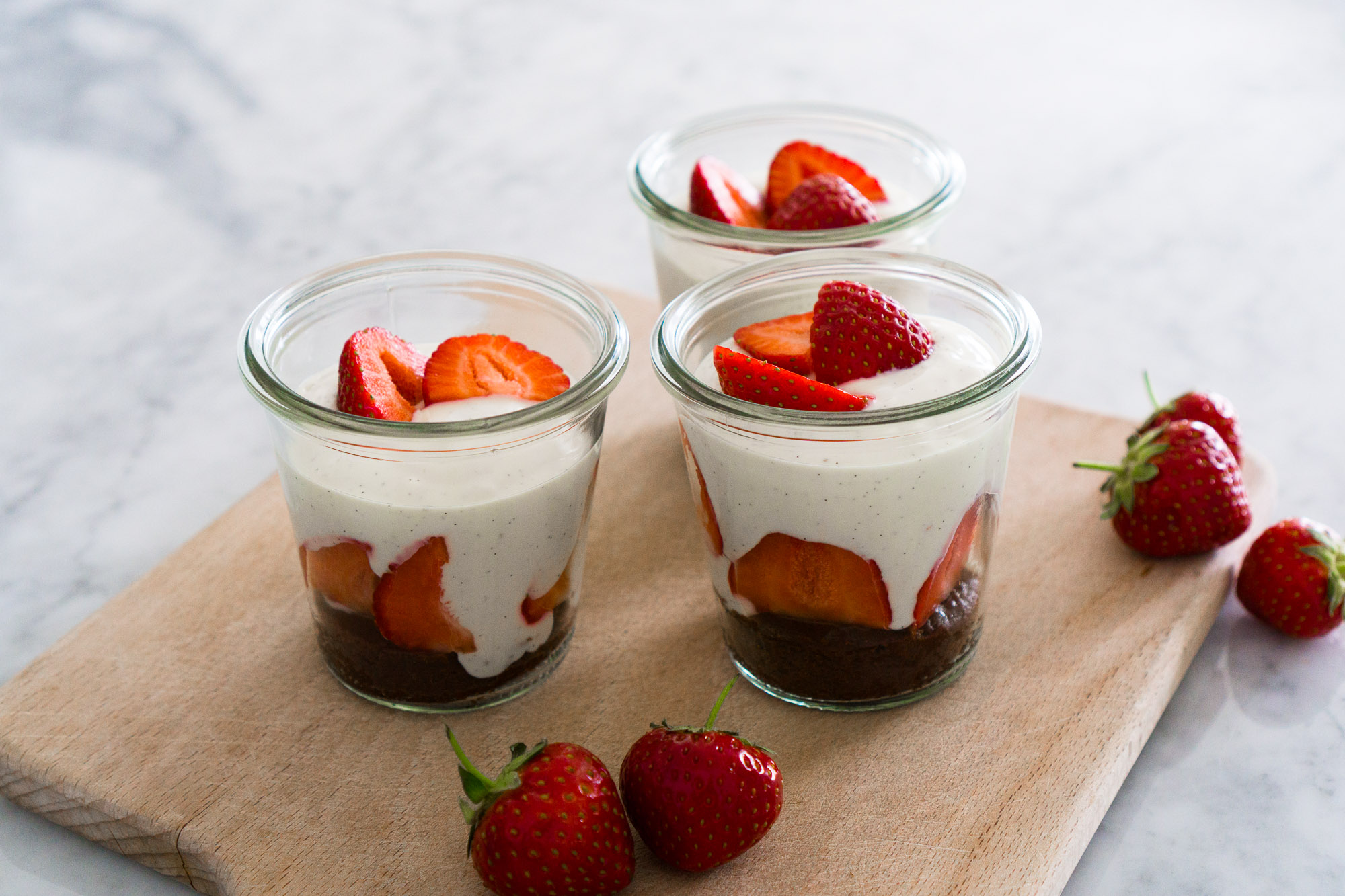 Für diese Rezeptkreation kombiniere ich die beiden Geschmacksklassiker Vanille und Schokolade mit der Erdbeere. Sie unterstreichen die fruchtige Süsse der einheimischen Beere bestens. Das Geschmackserlebnis im Mund, zusammen mit einer leichten, kühlen Crème und dem herzhaftem Schoko-Brownie, ist unglaublich bodenständig, aber dennoch überraschend. Ausserdem besteht problemlos die Möglichkeit, das Dessert vegan zu gestalten, da es mittlerweile tolle pflanzliche Alternativen für Milchprodukte gibt.